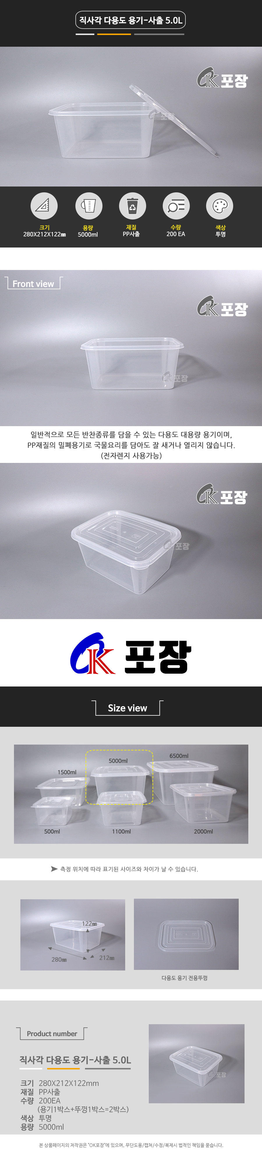 직사각사출-5.0L 몸통+뚜껑 / 100EA 직사각 다용도 용기