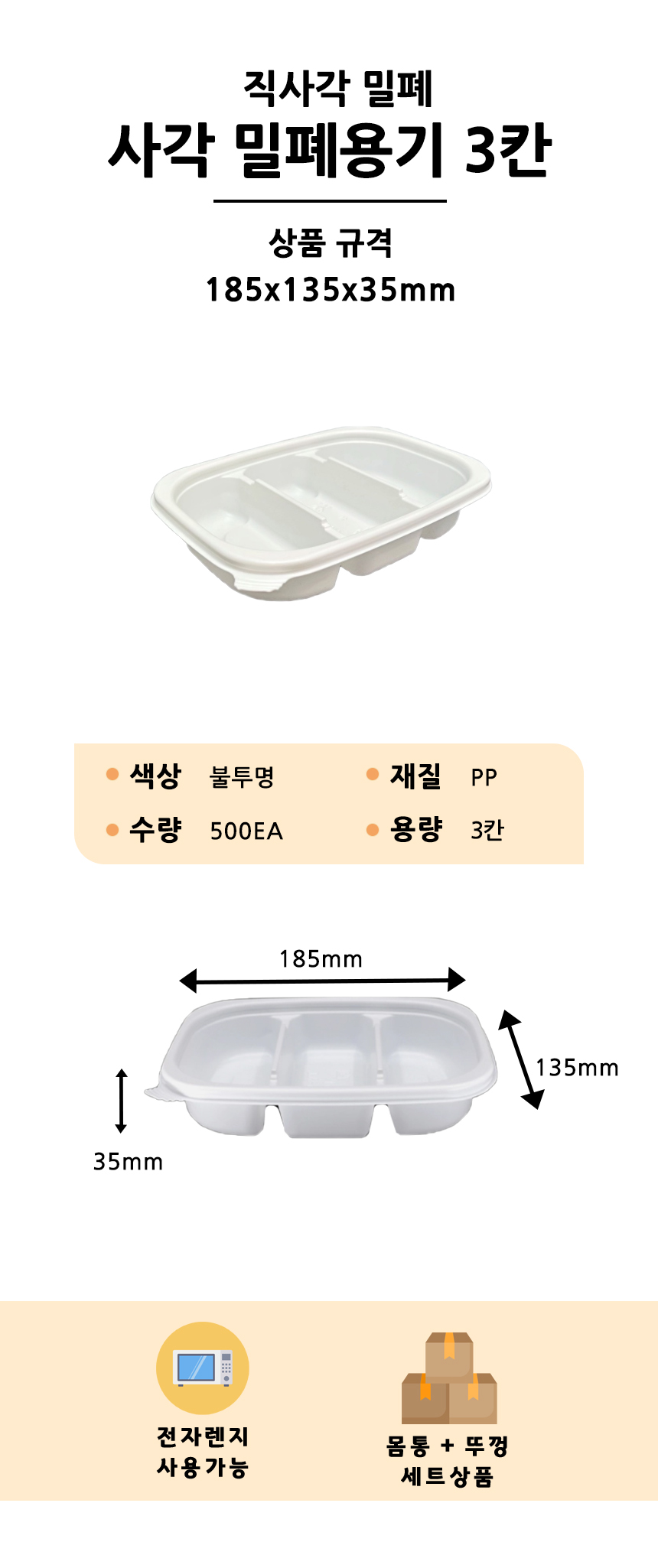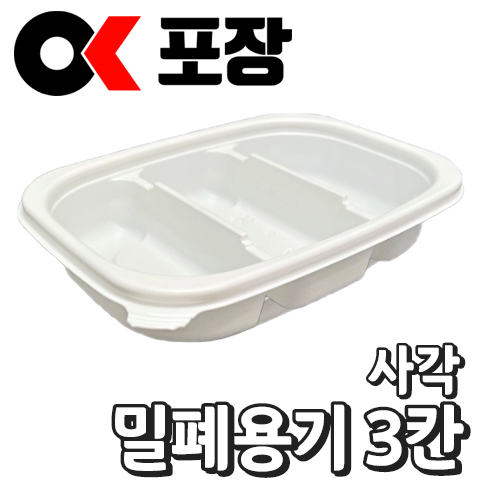 직사각 밀폐용기 3칸 몸통+뚜껑 세트 / 500개 / 반찬3칸 용기