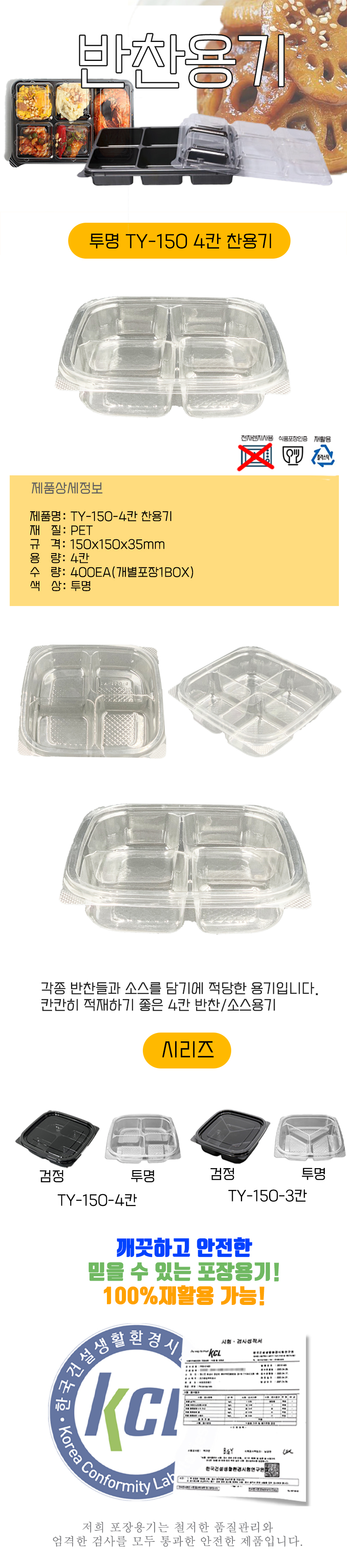 투명 TY-150-4 사각찬용기 4칸 몸통+뚜껑 세트 400개