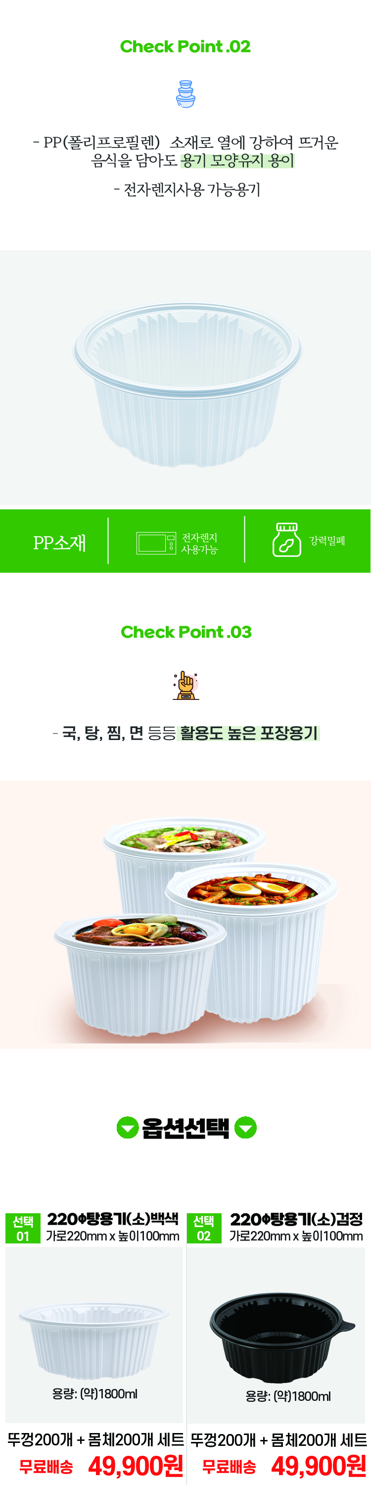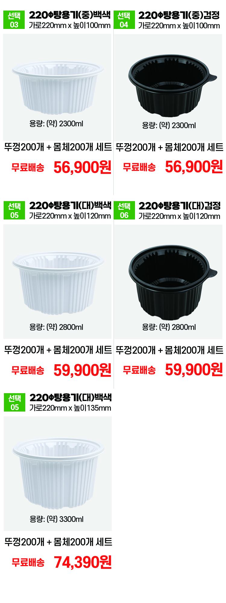 새지않는 일회용탕용기 220파이 소 중 대 특대 백색 검정 200세트